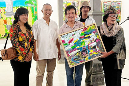 Pelukis Afnan Malay menyerahkan lukisan kepada budayawan Taufik Rahzen setelah membuka pameran lukisan Rup 3 Rupa di Jiwa Jawi Gallery, Bantul, Yogyakarta. (FOTO: Fb @afnan malay). KINGDOMSRIWIJAYA, Y...