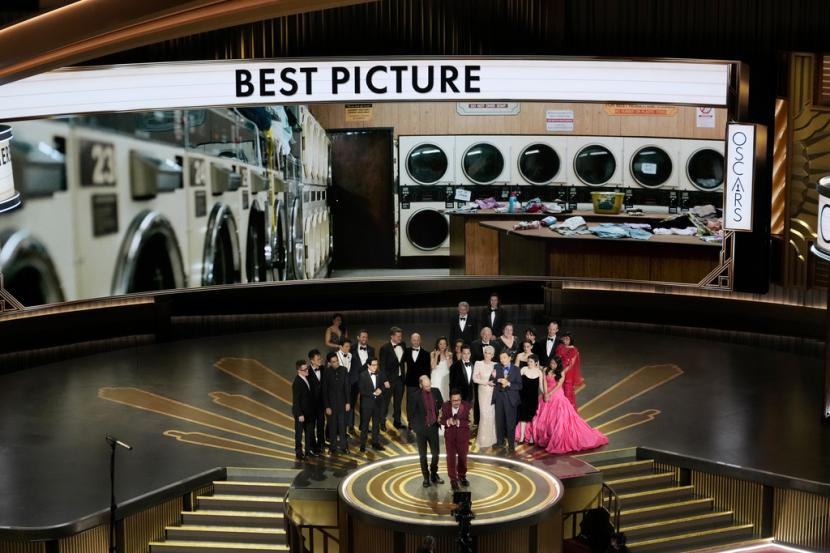 Pemain dan kru Everything Everywhere All at Once menerima penghargaan untuk film terbaik, Senin (13/3/2023), di Dolby Theatre, Los Angeles, AS. (FOTO : AP Photo/Chris Pizzello)