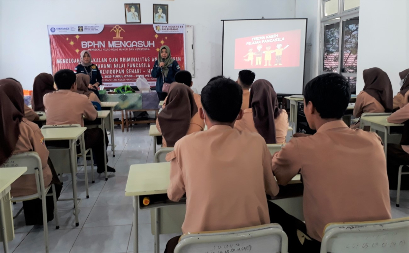 Kamis (13/4) para advokat PBH Peradi Palembang, Aina Rumiyati Aziz, Eka Novianti, Megaria dan Fenny Saskia Hasan melakukan penyuluhan di SMAN 14 Palembang dengan menyemai benih nilai Pancasila kepada para siswa melalui ceramah, tanya jawab dan pemutaran video klip lagu.