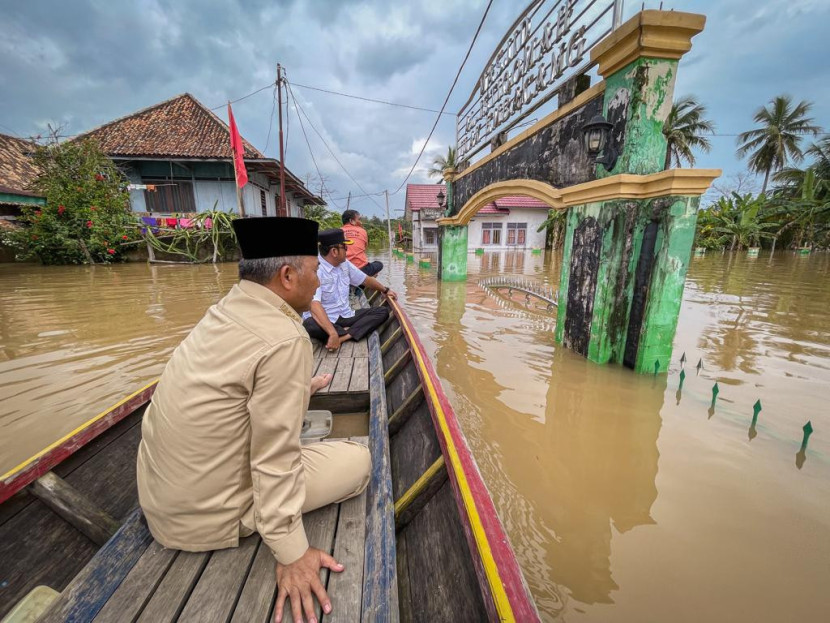 Dengan mendayung perahu sampan, Pj Bupati Muba menyambangi rumah warga terdampak banjir yang terjadi karena curah hujan yang tinggi beberapa hari terakhir yang mengakibatkan meluap air Sungai Musi dan anak sungai lainnya.