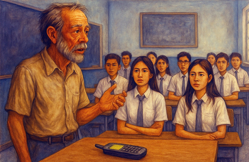 Pagi hari saat giliran membersihkan bagian dalam rumah, Pak Rudi menemukan ponsel tua itu. Ia mencoba menyalakannya, dan anehnya, ponsel itu masih berfungsi. Dengan penuh rasa ingin tahu, ia mulai memeriksa isi ponsel tersebut. Di dalamnya, ia menemukan beberapa pesan lama dari murid-muridnya yang penuh rasa hormat dan terima kasih. Namun, di antara pesan-pesan itu, ada satu pesan misterius yang tidak pernah ia lihat sebelumnya dari nomor yang tidak tercantum nama pemilik nomor tersebut. Pesannya, “Jika kau membaca ini, tolong bantu aku.”