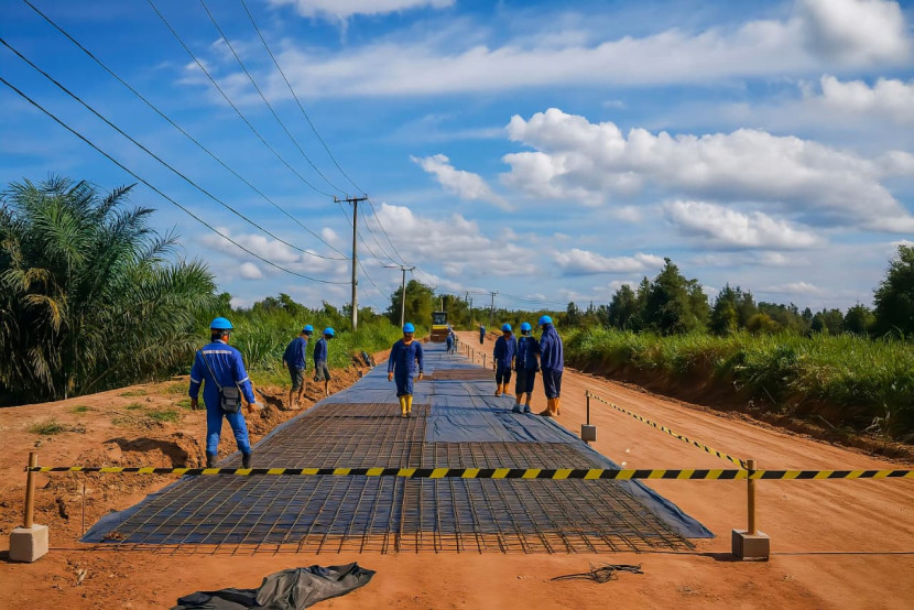Pengerjaan pembangunan jalan cor beton dari CSR PT OKI Pulp & Mills di Air Sugihan, Ogan Komering Ilir. (FOTO: Pulp Humas OKI)