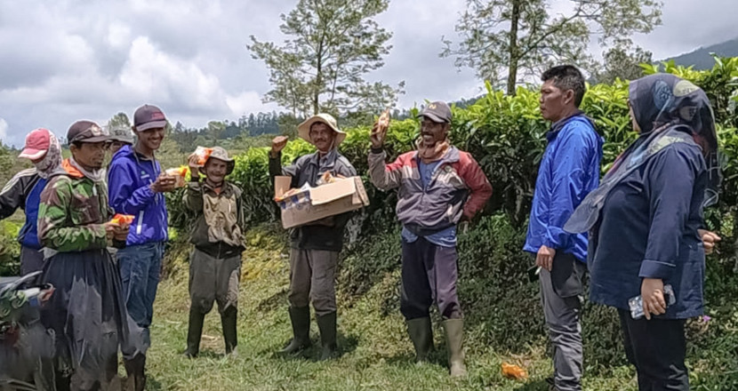 Adi Sukmawadi, Manajer PTPN I Regional 2 Kebun Cisaruni dan staf menyapa dan memberi apresiasi kepada para pahlawan produksi PTPN I. (FOTO: Humas PTPN I)