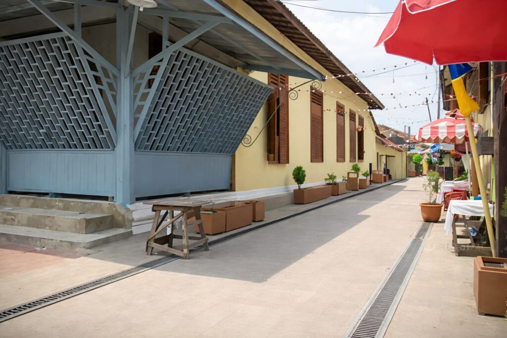 Rumah-rumah panggung di sini berdiri dengan keanggunan yang keras. Tiang-tiangnya tinggi, menantang gravitasi, menghadap langsung ke arah Laot Musi. (Budaya penduduk Palembang, sungai Musi itu disebut “laut”). Ia mengalir tenang membawa rahasia-rahasia masa lalu. Aku terpaku menatap ukiran jendela bercorak Timur Tengah yang duduk manis di atas struktur rumah Melayu.