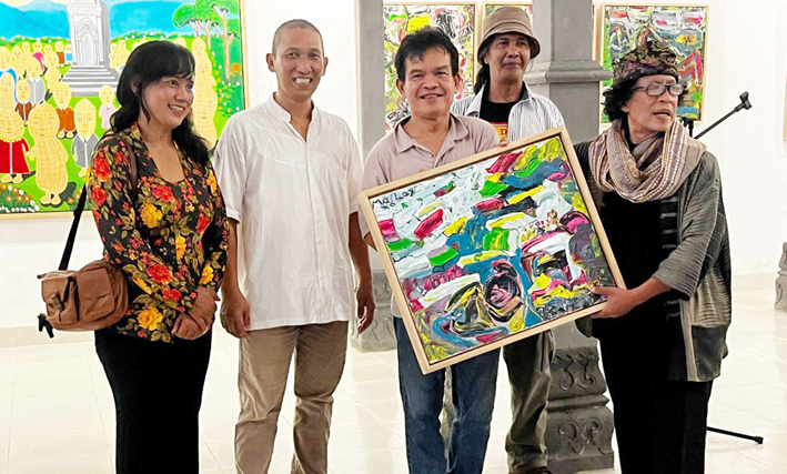 Pelukis Afnan Malay menyerahkan lukisan kepada budayawan Taufik Rahzen setelah membuka pameran lukisan Rup 3 Rupa di Jiwa Jawi Gallery, Bantul, Yogyakarta. (FOTO: Fb @afnan malay).