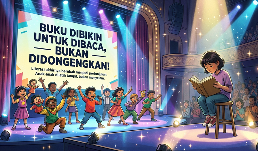 Anak-anak dilatih tampil, bukan menyelam. Mereka diajarkan percaya diri di panggung, tetapi tidak diajak bertahan dalam kesunyian membaca. Padahal membaca adalah kerja sunyi yang tidak bisa dipamerkan. Tidak ada tepuk tangan ketika seseorang berhasil menuntaskan satu bab buku filsafat yang bikin dahi berkerut. Tidak ada piala ketika seseorang selesai membaca sejarah setebal batu bata.