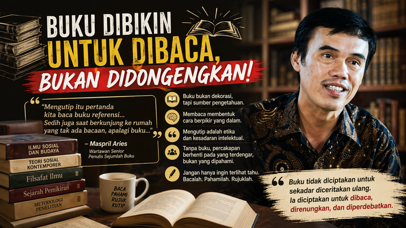 Kalimat ini mungkin terdengar agak sinis, tetapi ia lahir dari kegelisahan yang nyata. Maspril Aries, wartawan senior yang menulis sejumlah buku, dalam percakapan itu menyinggung satu hal krusial: gerakan literasi kita sering kali melenceng dari fungsi dasar buku. Kita merayakan dongeng, lomba pidato, membaca nyaring, storytelling penuh gaya—semuanya tampak meriah. Tapi di balik itu, ada sesuatu yang diam-diam ditinggalkan: kemampuan memahami teks secara mendalam.