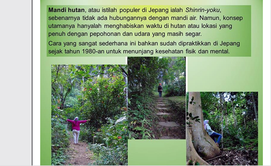 Salah satu aktivitas yang ditawarkan adalah berjalan di dalam hutan. Aktivitas ini mungkin terdengar sederhana, tetapi memiliki dampak yang besar bagi kesehatan mental dan fisik. Di tengah kesibukan dan tekanan hidup, berjalan di hutan memberikan ruang untuk bernapas, untuk diam, dan untuk kembali terhubung dengan diri sendiri.