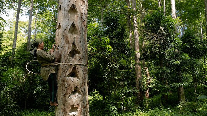 Ilustrasi perempuan di Krui, Pesisir Barat sedang memanjat pohon damar. (FOTO: AI).