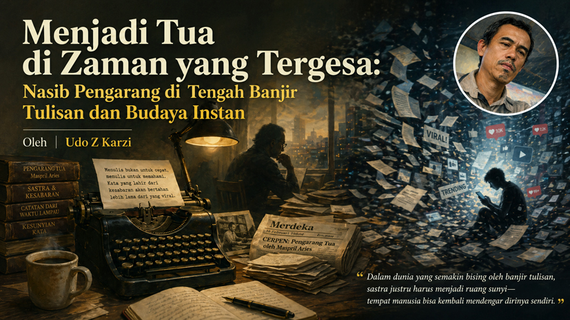 CERPEN “Pengarang Tua” karya Maspril Aries, yang pernah dimuat di Merdeka Minggu, 16 Februari 1986, menghadirkan potret getir seorang penulis yang terdesak oleh waktu, perubahan zaman, dan mungkin juga oleh dirinya sendiri. Dalam cerita itu, kita seperti diajak menatap wajah kesepian seorang pengarang yang dahulu hidup dari kata-kata, tetapi kini justru ditinggalkan oleh dunia yang semakin tak sabar terhadap kedalaman. Cerita ini tidak sekadar kisah personal, melainkan alegori tentang nasib kepengarangan—dulu, kini, dan mungkin nanti.