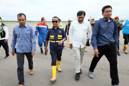 General Manager PT Medco E & P Malaka Tutu Paniji, Menteri ESDM Bahlil Lahadalia, Kepala BPMA Nasri Jalal, dan Senior VP Onshore Medco E&P Asset I Nyoman A. Sidi Mantra kembali menyalurkan ban...