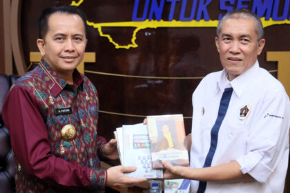Pj Gubernur Sumsel menerima enam judul buku dari wartawan Maspril Aries. (FOTO-FOTO: Humas Pemprov Sumsel) KAKI BUKIT – Kesempatan bertemu langsung dengan Penjabat (Pj) Gubernur Sumatera Selatan (Sums...