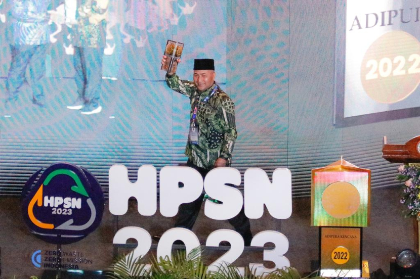 Penjabat Bupati Muba Apriyadi mengangkat Piala Adipura yang berhasil diraih Kota Sekayu untuk kategori Kota Kecil dari Kementerian Lingkungan Hidup dan Kehutanan. (FOTO : Dinas Kominfo Muba) KAKI BUKI...