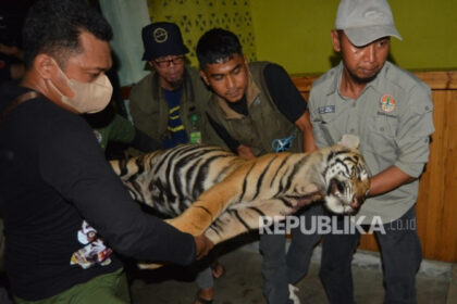 Petugas Balai Konservasi Sumber Daya Alam (BKSDA) memindahkan tubuh Harimau Sumatera (Panthera tigris sumatrae) di UPTD Rumah Sakit Hewan Sumatera Barat, di Padang, Selasa (16/5/2023). (FOTO : ANTARA ...