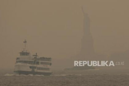 Patung Liberty yang diselimuti langit berkabut difoto dari Staten Island Ferry di New York, Kamis (8/6/2023) WIB (FOTO : AP/ Yuki Iwamura) KAKI BUKIT – Kanada kini tengah dilanda kebakaran hutan dan l...