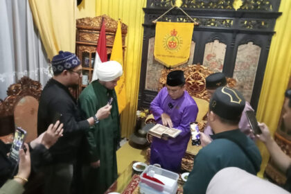SMB IV memperlihatkan Alquran kuno bertinta emas yang dicetak akhir abad 17-an milik SMB II yang berasal dari Kesultanan Turki Usmani. (FOTO: D Oskandar) KINGDOMSRIWIJAYA – Dalam rangka kunjungan muhi...