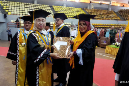 Rektor Unila Lusmeilia Afriani (ke dua dar kiri) berikat surat keputusan pengukuhan guru besar kepada Ari Damastuti dosen Fisip Unila. (FOTO : Dok. Ari Darmastuti) KAKI BUKIT, Bandarlampung – Pada rap...